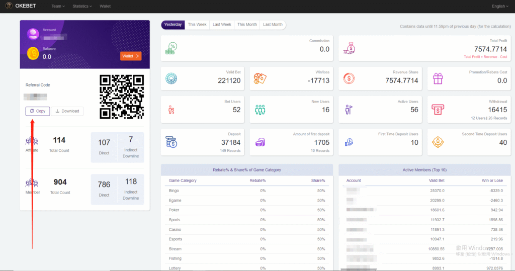 Click the “copy” button pointed by the red arrow to copy your referral link. Any member who uses your referral link to register will belong to your team. As long as your member continues to bet on OKEBET, You can permanently receive the profit your members generates for you.
